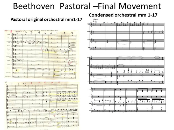 I said, "Keep as close to the original bass line as possible, but Beethoven has FOUR different bass lines! Bass lines are in double-bass, cello, bassoon, and even the French horn, which, in the original key of F, goes down to its lowest note, the 2nd space C in the bass clef!