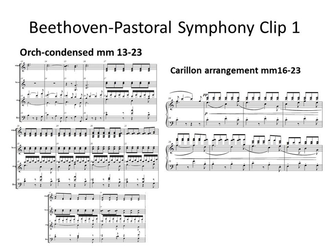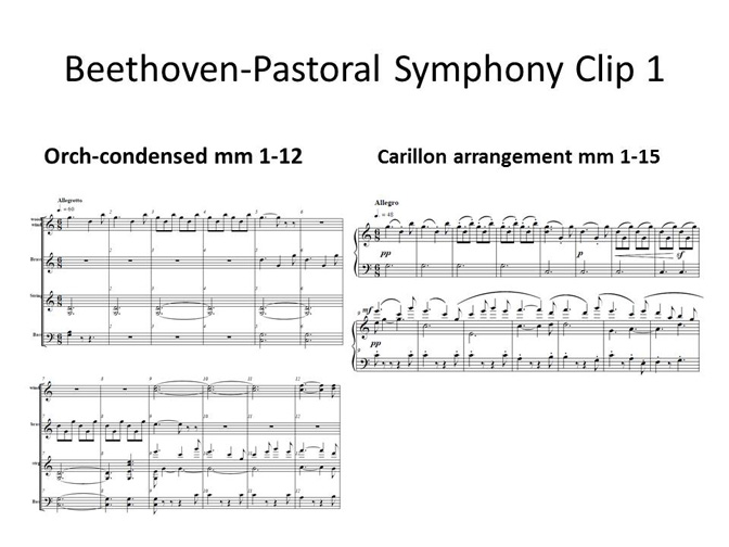 Beethoven, Pastoral Symphony No. 6, final movement. Introduction and Section 1OK, not the WHOLE final movement, which lasts 12 minutes. I abridged it. Holding the original orchestral score, I listened to the recording from the movie "Fantasia" and marked their cuts. Then I changed them a little to keep the important transitional passages, and finished with a 5-minute piece. Slowed down for carillon, it will be 6 minutes. I find that as a general rule, I have to slow tempi down from the originals, in order to let the bells fully ring. I noticed that in the original key of F-Major, the lines would be ruined if I cut them off at the low C, but transposed up to C-major fit almost all of it into the 4-octave range! just use a few optional notes down to the lowest G on the bass clef.