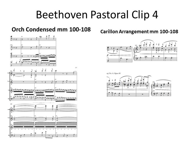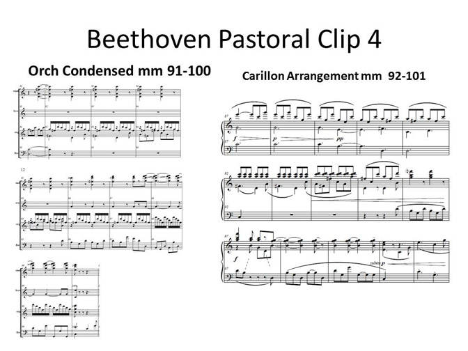 mm 92-100, building up to final climax. Fast 16th notes in strings, too much for carillon. Put 8th notes in triplet rhythm on top, with dissonances pushing to resolution. Theme in middle layer and even bass layer. M100, final 8th beat apportamento emphasizes new harmonic buildup to climax.