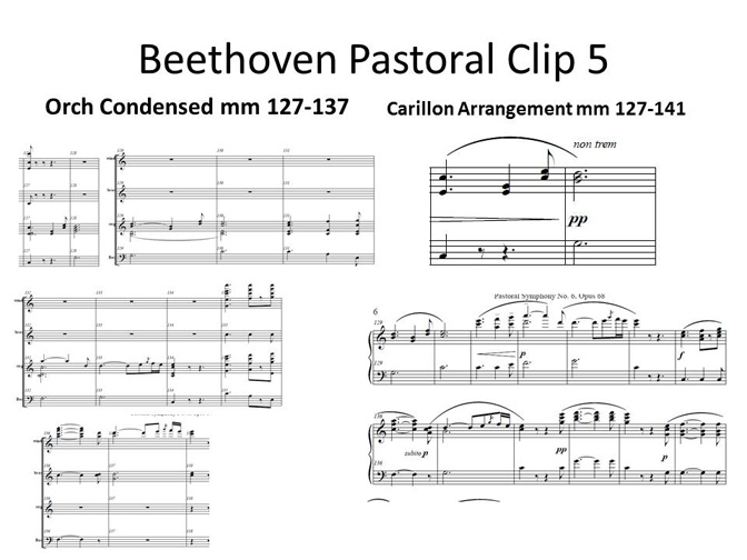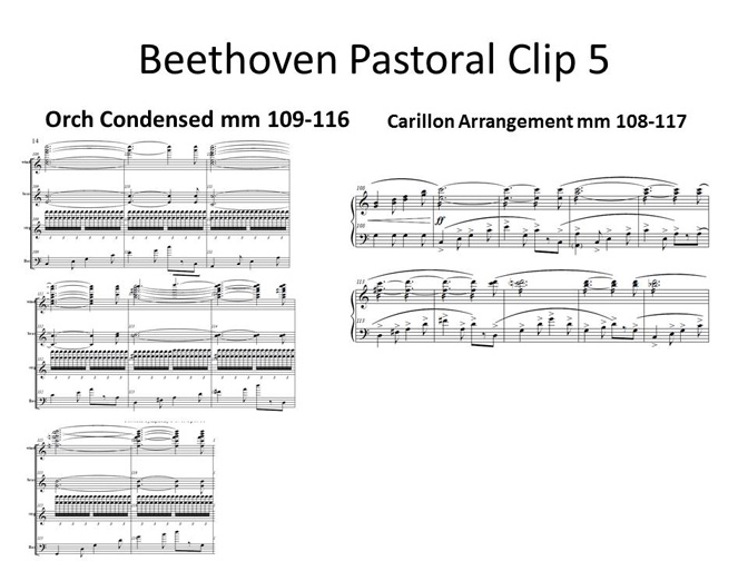 mm 109-116, climax of whole symphony. Forceful 16th note triplets in strings are a very SPECIFIC type of tremolo. Most effective in wider intervals. Bass bells get to be the big story and should come out strong, indicated by marcati. Put in optional bells down to low G. Must consider reach of player from low pedal to high bells' tremolos. Want ALL the low bass notes, but sometimes must compromise and use G at top space, bass clef. Must remember how powerful ALL the low bells really are! Carillonneur should only play optional low A if comfortable musically.